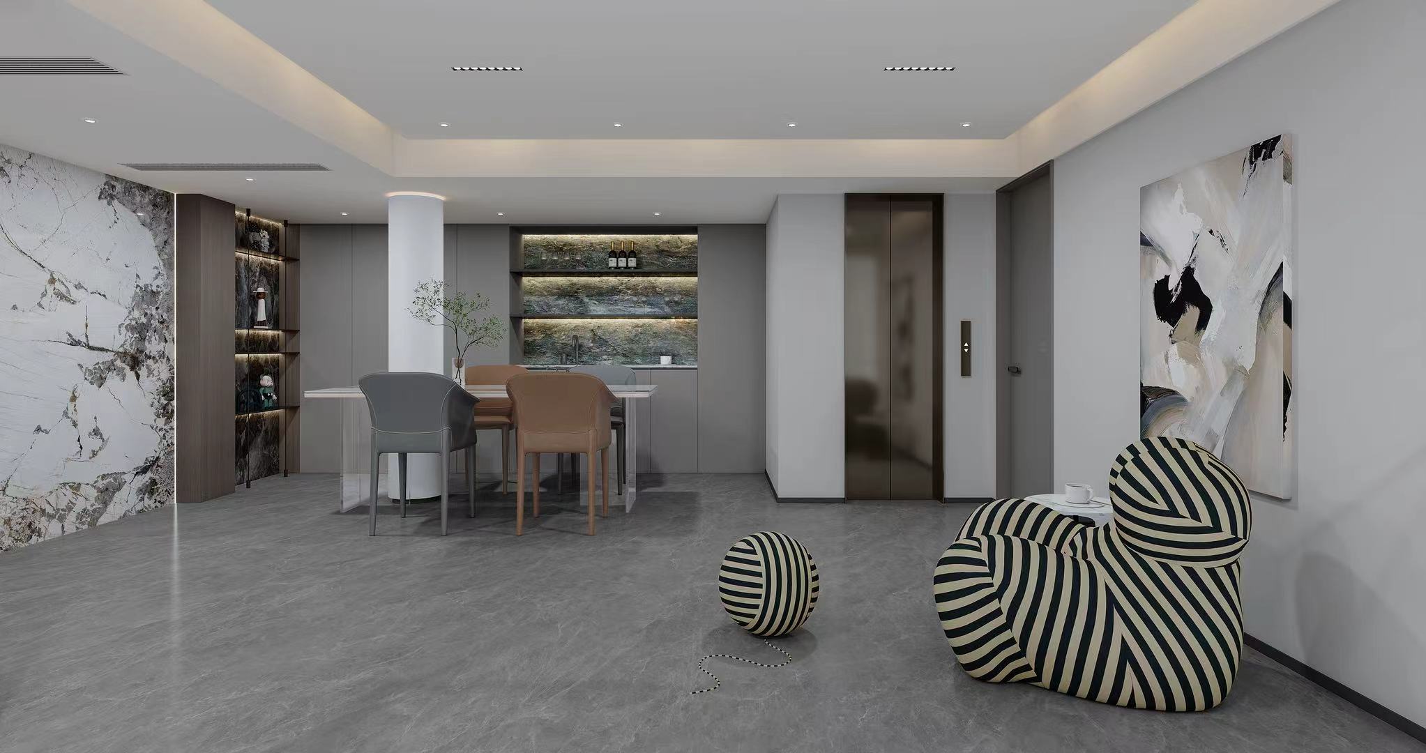负二层设专属停车区与休闲会客区,负一层规划轻社交与辅助生活区,嵌入电梯提升通行效率。一层以挑空客厅为核心,中西厨、餐厅与客厅开放式联动,适配家庭聚会、宴请等多元需求。