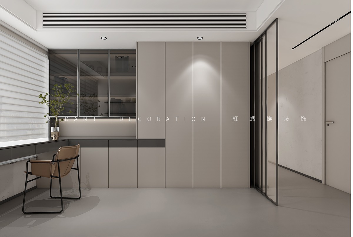 本方案以现代主义为核心,以浅米白、深炭灰的色彩对比,搭配微水泥、木饰面等材质,打造兼具秩序感与温度感的居住空间。餐厨区以深炭灰橱柜配白色台面,红色吊灯作焦点,长虹玻璃移门实现空间互动;客厅以浅米色沙发为核心,深绿大理石茶几、艺术挂画营造松弛高级氛围;卧室以一体化背景墙、通顶柜优化空间,浅灰床品、原木地板弱化冷感,全景窗引入城市景观。设计以动线、质感、功能为核心,融合秩序美学与松弛舒适,提升居住品质。