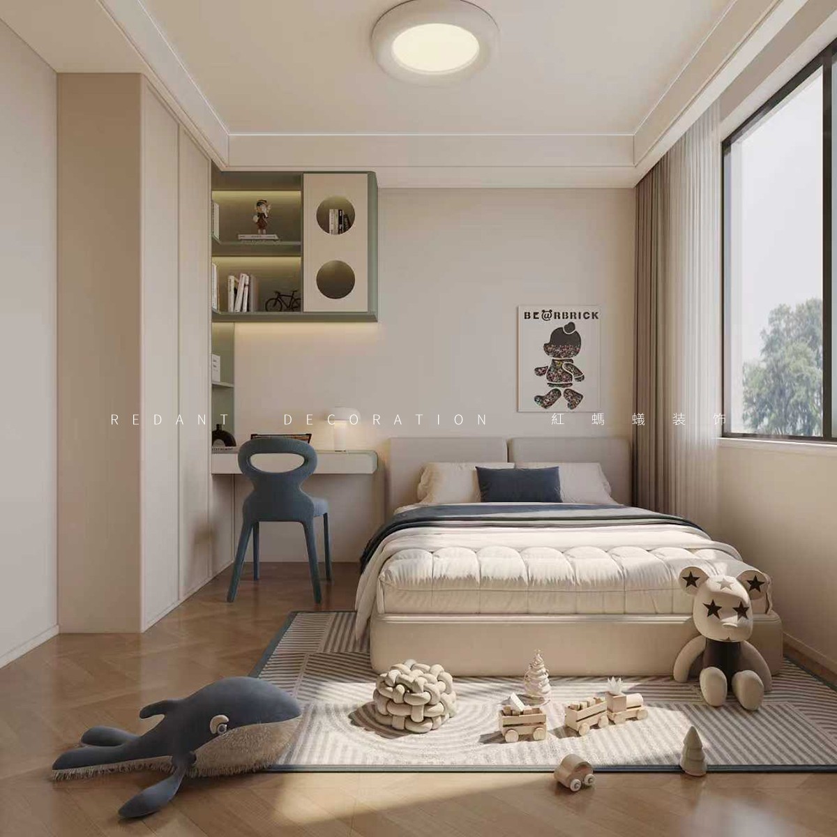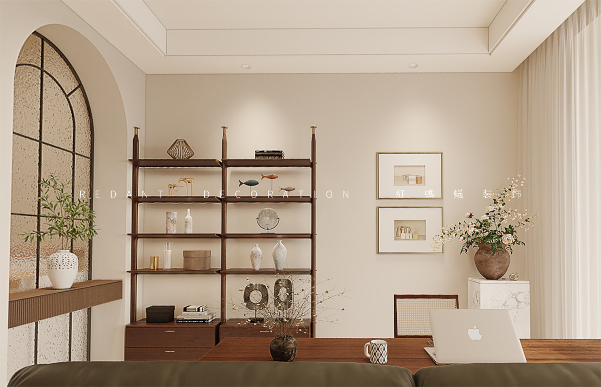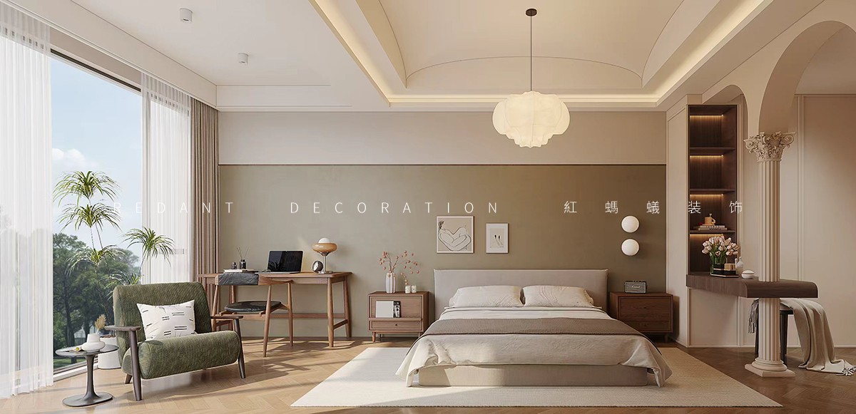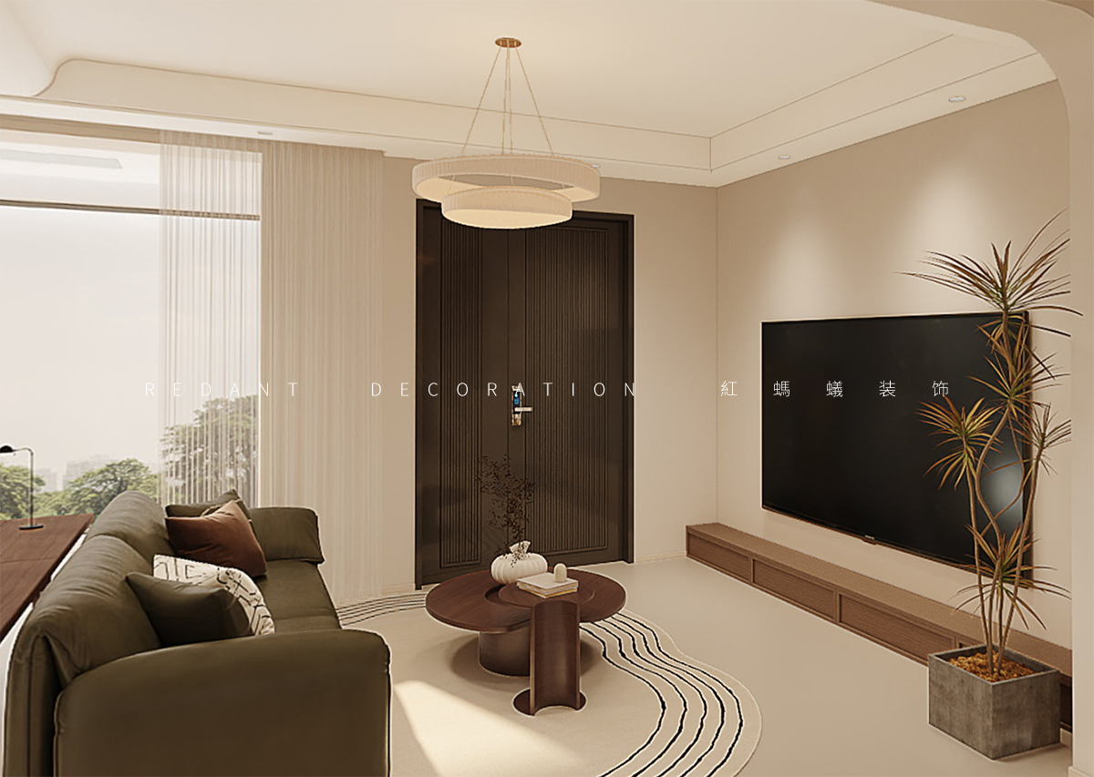 本方案以复古奶油风融合中古风为核心,以奶咖、橄榄绿与胡桃木色为基调,搭配实木、皮革、棉麻材质及弧形线条、复古灯具,打造优雅松弛的高端居住空间。公共区开放式布局,橄榄绿弧形沙发为焦点,配胡桃木茶几、复古单椅,弧形吊顶柔化边界,开放书架与绿植添生机;主卧延续低饱和色调,奶咖墙配胡桃木家具,复古绿休闲椅与绿植呼应,嵌入式开放格加罗马柱细节,以流畅动线、细腻材质、精准色彩,满足社交生活与精神松弛需求。